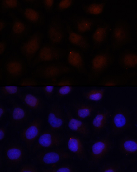 Immunofluorescence analysis of HeLa cells using ACADSB antibody at dilution of 1:100 (40x lens). Blue: DAPI for nuclear staining.