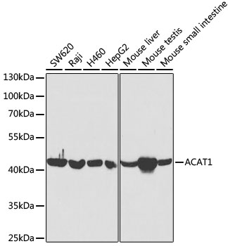 Western blot analysis of extracts of various cell lines, using ACAT1 antibody at 1:5000 dilution.Secondary antibody: HRP Goat Anti-Rabbit IgG (H+L) at 1:10000 dilution.Lysates/proteins: 25ug per lane.Blocking buffer: 3% nonfat dry milk in TBST.Detection: ECL Basic Kit .Exposure time: 10s.