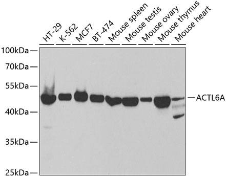 Western blot analysis of extracts of various cell lines, using ACTL6A antibody at 1:1000 dilution._Secondary antibody: HRP Goat Anti-Rabbit IgG (H+L) at 1:10000 dilution._Lysates/proteins: 25ug per lane._Blocking buffer: 3% nonfat dry milk in TBST._Detection: ECL Basic Kit ._Exposure time: 30s.