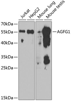 Western blot analysis of extracts of various cell lines, using AGFG1 antibody at 1:1000 dilution.Secondary antibody: HRP Goat Anti-Rabbit IgG (H+L) at 1:10000 dilution.Lysates/proteins: 25ug per lane.Blocking buffer: 3% nonfat dry milk in TBST.Detection: ECL Basic Kit .Exposure time: 90s.