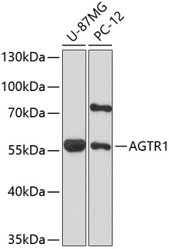 Western blot analysis of extracts of various cell lines, using AGTR1 antibody at 1:1000 dilution.Secondary antibody: HRP Goat Anti-Rabbit IgG (H+L) at 1:10000 dilution.Lysates/proteins: 25ug per lane.Blocking buffer: 3% nonfat dry milk in TBST.Detection: ECL Basic Kit .Exposure time: 10s.