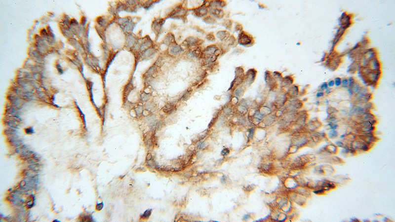 Immunohistochemical of paraffin-embedded human ovary tumor using Catalog No:107853(AIFM3 antibody) at dilution of 1:50 (under 10x lens)