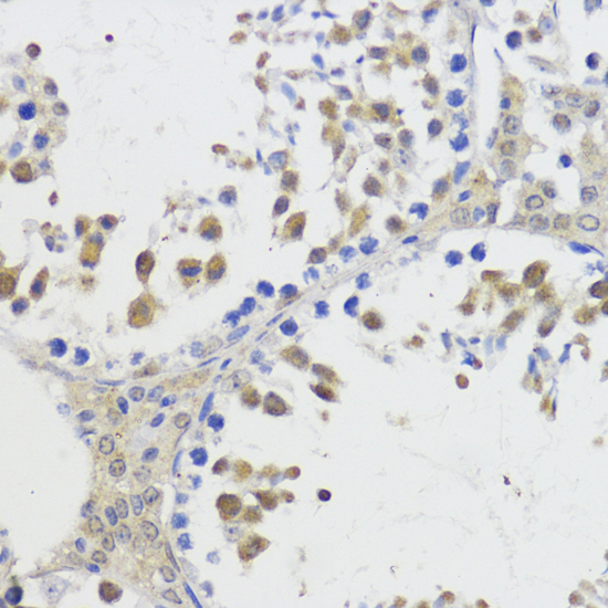 Immunohistochemistry of paraffin-embedded mouse testis using AKT2 antibody at dilution of 1:200 (40x lens).