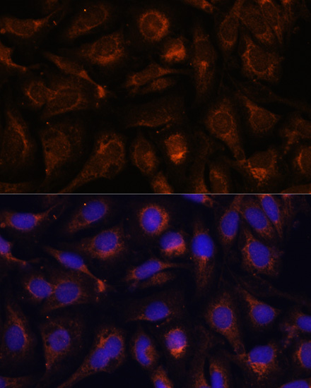 Immunofluorescence analysis of U2OS cells using AKT2 antibody at dilution of 1:100. Blue: DAPI for nuclear staining.