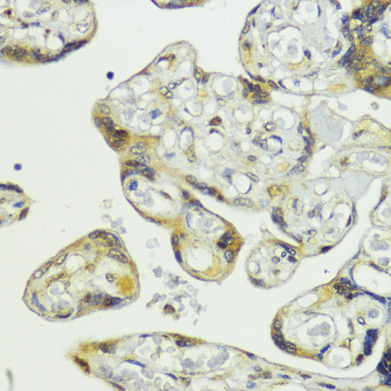 Immunohistochemistry of paraffin-embedded human placenta using AKT2 antibody at dilution of 1:200 (40x lens).