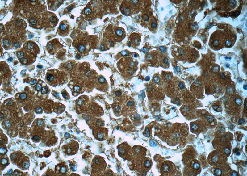 Immunohistochemistry of paraffin-embedded human liver tissue slide using Catalog No:107861(SERPINA3,AACT Antibody) at dilution of 1:50