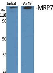 Fig1:; Western Blot analysis of various cells using MRP7 Polyclonal Antibody diluted at 1: 1000