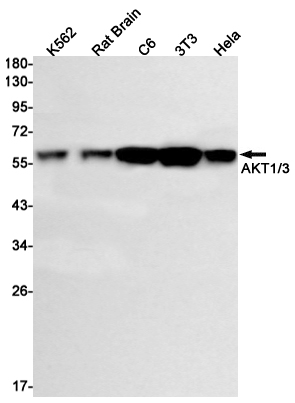 Western blot detection of AKT1/3 in K562,Rat Brain,C6,3T3,Hela cell lysates using AKT1/3 Rabbit mAb(1:1000 diluted).Predicted band size:56kDa.Observed band size:56kDa.