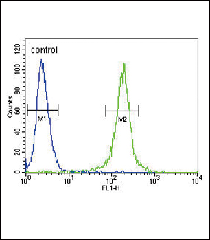 AMH Antibody (Center) (Cat. #169062) flow cytometric analysis of 293 cells (right histogram) compared to a negative control cell (left histogram).FITC-conjugated goat-anti-rabbit secondary antibodies were used for the analysis.