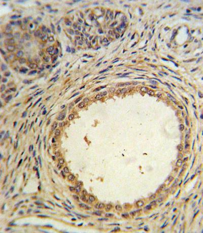 AMH Antibody (Center) (Cat. #169062) IHC analysis in formalin fixed and paraffin embedded prostate carcinoma followed by peroxidase conjugation of the secondary antibody and DAB staining. This data demonstrates the use of the AMH Antibody (Center) for i