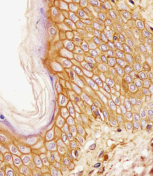 169110 staining CD44 in human skin tissue sections by Immunohistochemistry (IHC-P - paraformaldehyde-fixed, paraffin-embedded sections). Tissue was fixed with formaldehyde and blocked with 3% BSA for 0. 5 hour at room temperature; antigen retrieval was by heat mediation with a citrate buffer (pH6). Samples were incubated with primary antibody (1/25) for 1 hours at 37°C. A undiluted biotinylated goat polyvalent antibody was used as the secondary antibody.