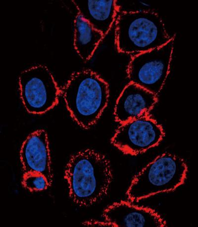 CD44 antibody (Cat. #169110) confocal immunofluorescent analysis with hela cell. 0.01 mg/ml primary antibody was followed by PE-conjugated goat anti-mouse lgG (whole molecule). PE emits red fluorescence. DAPI was used to stain the cell nuclear (blue).