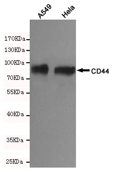 Western blot detection of CD44 in A549 and Hela cells using CD44 Mouse mAb(dilution 1:1000).Predicted band size:81kDa.Observed band size:81kDa.