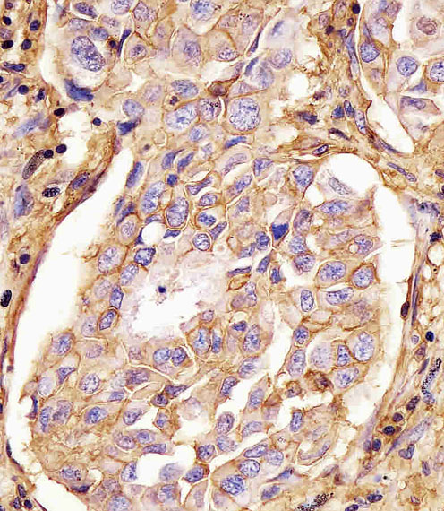 169110 staining CD44 in human lung adenocarcinoma tissue sections by Immunohistochemistry (IHC-P - paraformaldehyde-fixed, paraffin-embedded sections). Tissue was fixed with formaldehyde and blocked with 3% BSA for 0. 5 hour at room temperature; antigen retrieval was by heat mediation with a citrate buffer (pH6). Samples were incubated with primary antibody (1/25) for 1 hours at 37°C. A undiluted biotinylated goat polyvalent antibody was used as the secondary antibody.