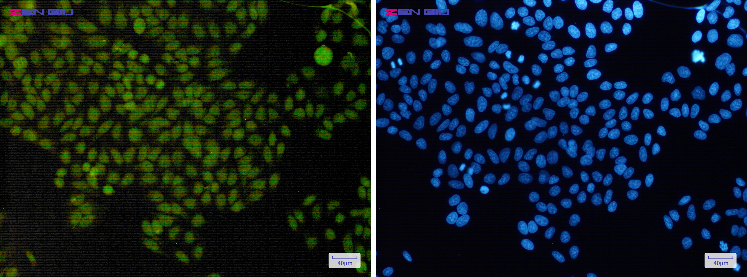 Immunocytochemistry of APE1(green) in Hela cells using APE1 Rabbit pAb at dilution 1/50, and DAPI(blue)