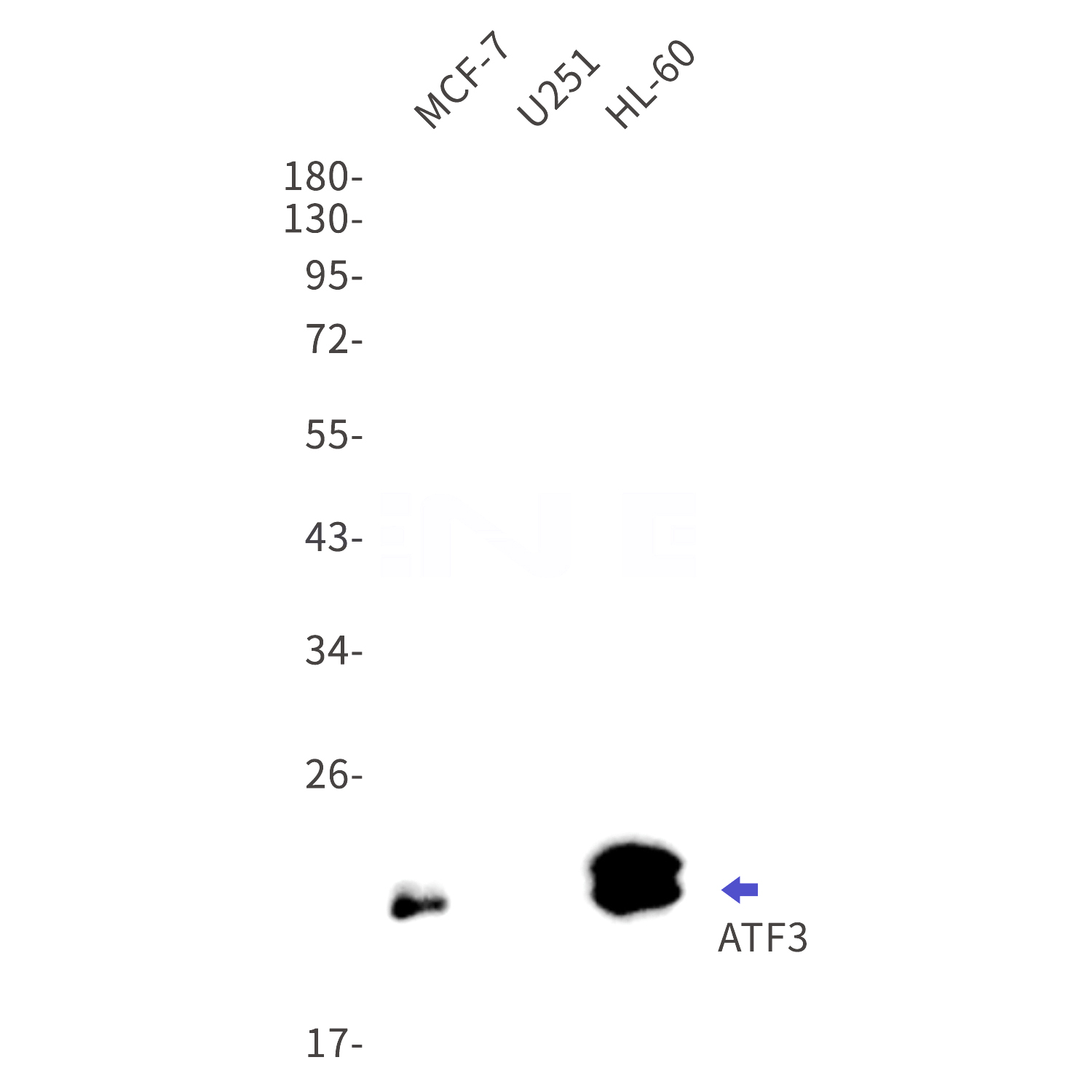Western blot detection of ATF3 in MCF-7,U251,HL-60 cell lysates using ATF3 Rabbit mAb(1:1000 diluted).Predicted band size:21kDa.Observed band size:21kDa.