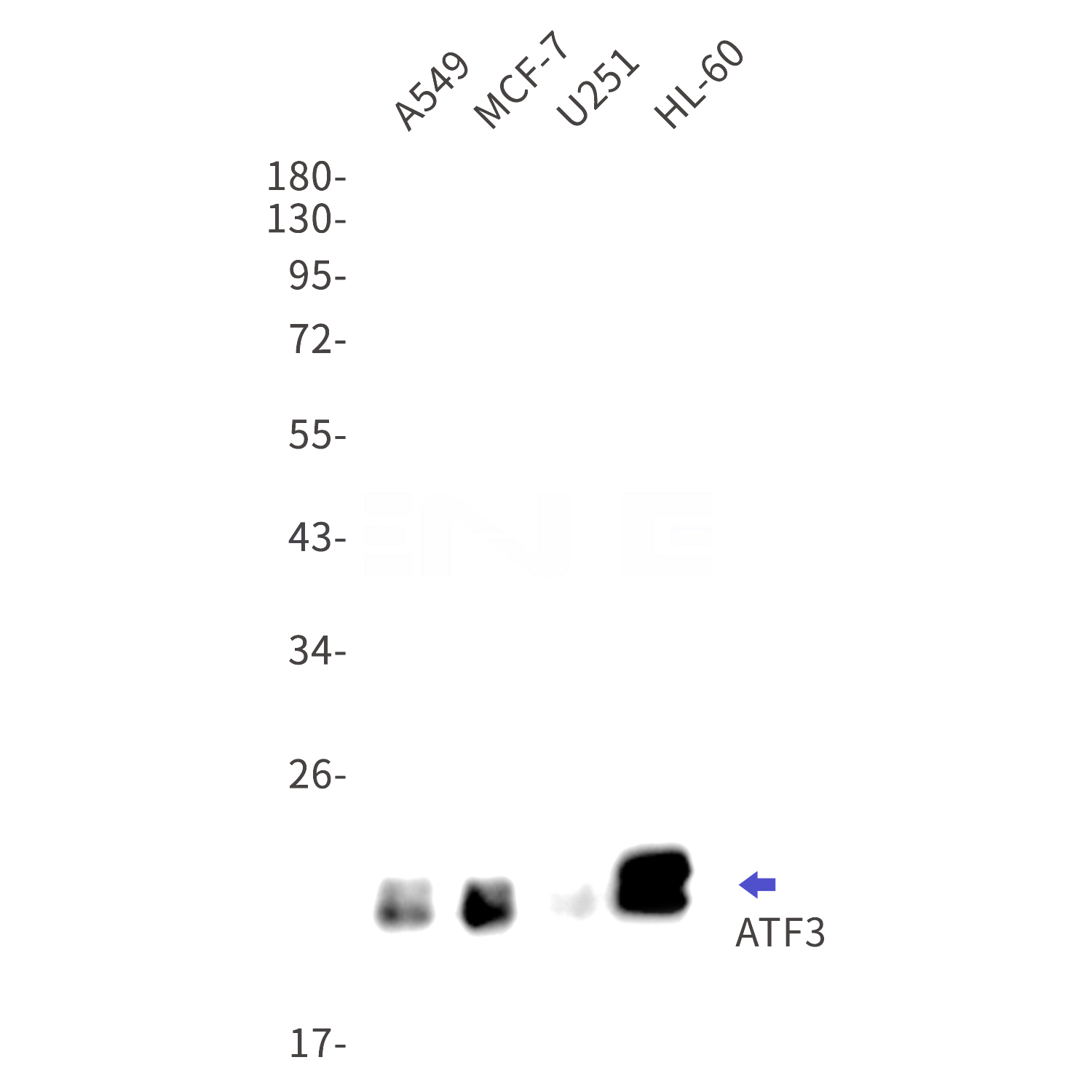 Western blot detection of ATF3 in A549,MCF-7,U251,HL-60 cell lysates using ATF3 Rabbit mAb(1:1000 diluted).Predicted band size:21kDa.Observed band size:21kDa.