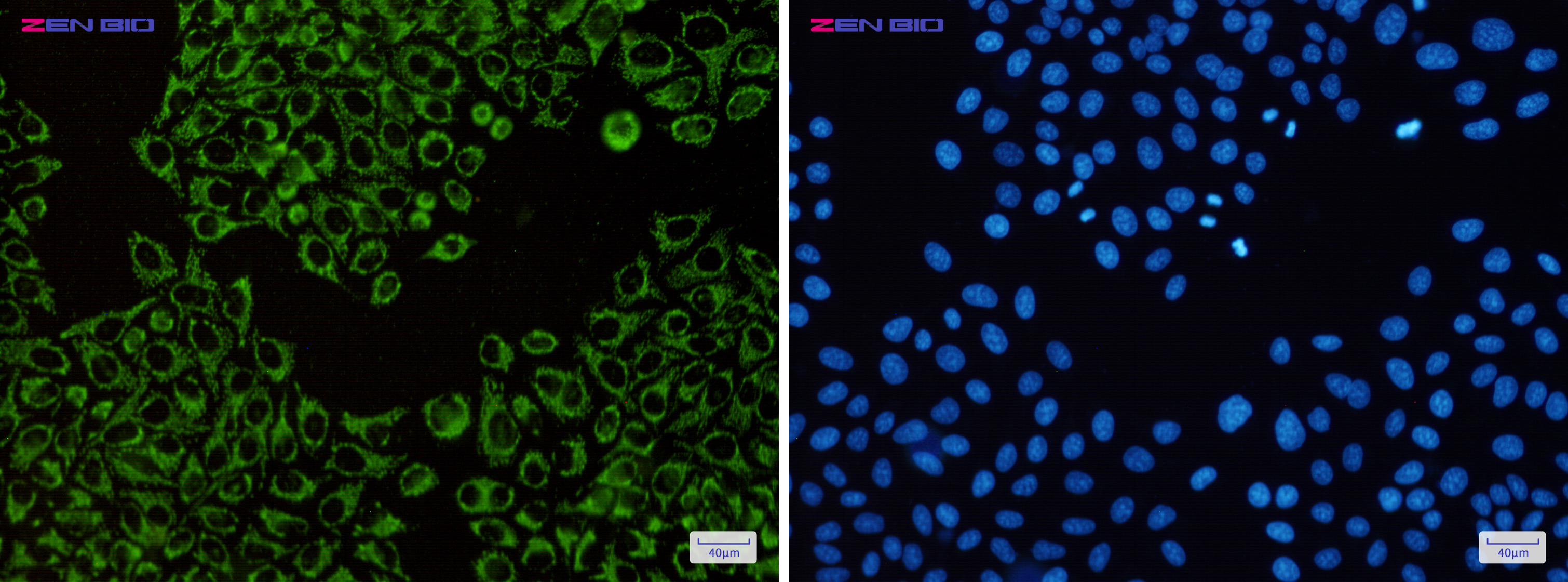 Immunocytochemistry of ATPB(green) in Hela cells using ATPB Rabbit pAb at dilution 1/50, and DAPI(blue)