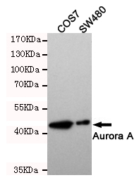 Western blot detection of Aurora Kinase A in SW480 and COS7 cell lysates and using Aurora Kinase A mouse mAb (1:500 diluted).Predicted band size: 46KDa.Observed band size:46KDa.