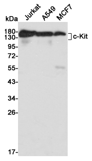Western blot analysis of extracts from Jurkat, A549 and MCF7 cell lysates using c-Kit mouse mAb (1:1000 diluted).Predicted band size:145KDa.Observed band size:120~145KDa.