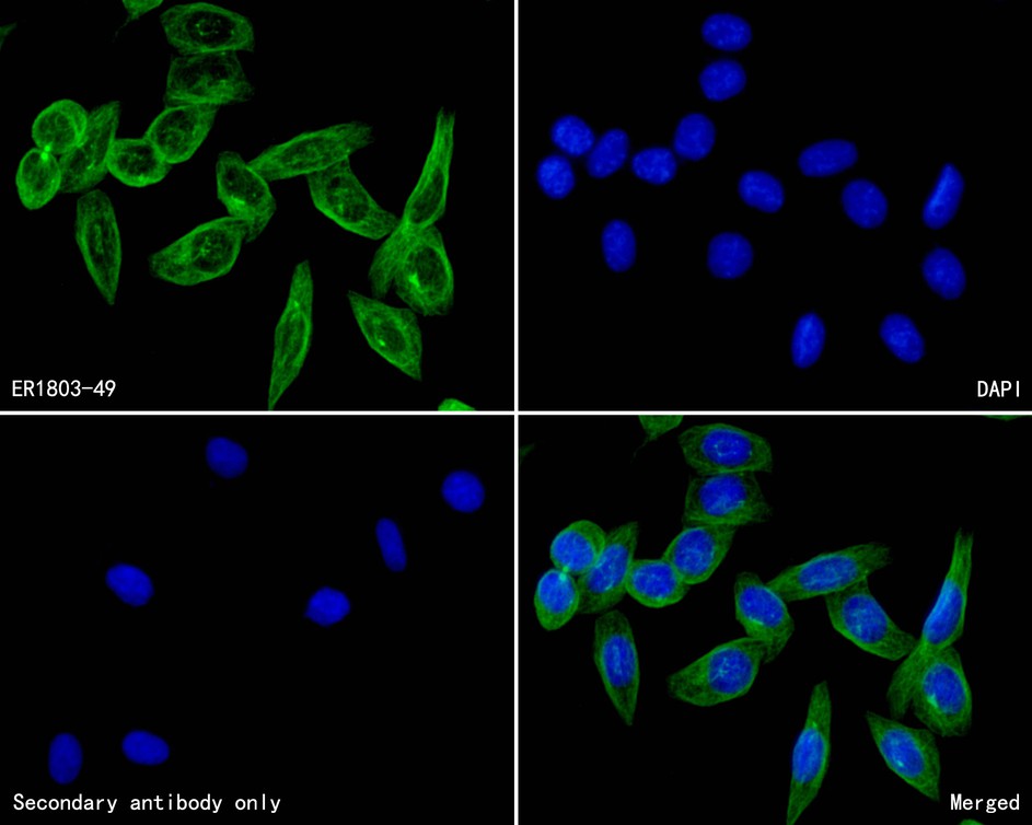 Fig2: ICC staining CACNA1C in SKOV-3 cells (green). The nuclear counter stain is DAPI (blue). Cells were fixed in paraformaldehyde, permeabilised with 0.25% Triton X100/PBS.