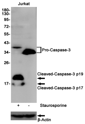 Western blot analysis of extracts from Jurkat cells, untreated (-) or treated with Staurosporine (1 μM; 3 hr), using Caspase-3 Rabbit pAb (166660, upper) or β-Actin (8F10) Mouse mAb (lower).