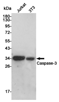 Western blot detection of Caspase-3 in Jurkat and 3T3 cell lysates using Caspase-3 Rabbit pAb (1:1000 diluted). Predicted band size: 35KDa. Observed band size:35KDa.