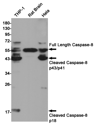 Western blot detection of Caspase-8 in THP-1,Rat Brain,Hela cell lysates using Caspase-8 (4C2) Mouse mAb(1:1000 diluted).Predicted band size:43,57KDa.Observed band size:54/43/18KDa.