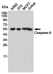 Western blot detection of Caspase-8 in K562,3T3,MCF7 and Jurkat cell lysates using Caspase-8 mouse mAb (1:2000 diluted).Predicted band size:57kDa.Observed band size:57kDa.