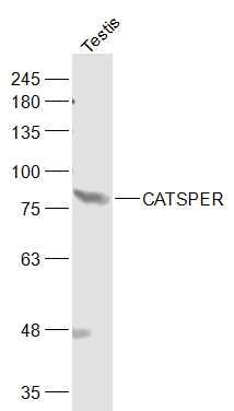 Fig1: Sample:; Testis (Mouse) Lysate at 40 ug; Primary: Anti-CATSPER at 1/1000 dilution; Secondary: IRDye800CW Goat Anti-Rabbit IgG at 1/20000 dilution; Predicted band size: 90 kD; Observed band size: 85 kD
