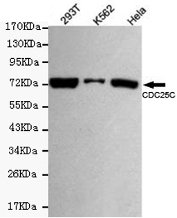 Western blot detection of Cdc25C in 293T,Hela and K562 cell lysates using Cdc25C mouse mAb (1:500 diluted).Predicted band size:60/75KDa.Observed band size:75KDa.