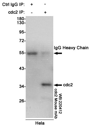Immunoprecipitation analysis of Hela cell lysates using cdc2 mouse mAb.