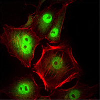 Immunofluorescence analysis of Hela cells using CDC2 mouse mAb (green). Red