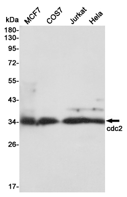 Western blot detection of cdc2 in MCF7,COS7,Jurkat and Hela,3T3 cell lysates using cdc2 mouse mAb (1:1000 diluted).Predicted band size:34KDa.Observed band size:34KDa.