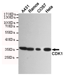 Western blot detection of CDK1 in A431,Ramos,COS7 and Hela cell lysates using CDK1 mouse mAb (1:500 diluted).Predicted band size: 34KDa.Observed band size:34KDa.
