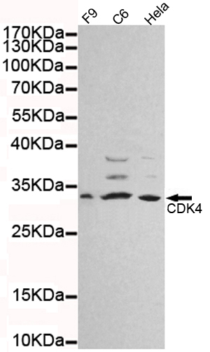 Western blot detection of CDK4 in Hela,C6 and F9 cell lysates using CDK4 mouse mAb (1:1000 diluted).Predicted band size:34KDa.Observed band size:34KDa.