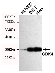 Western blot analysis of extracts from Hela,293T and HUVEC cells using CDK4 rabbit pAb (1:1000 diluted).Predicted band size:34KDa.Observed band size:34KDa.