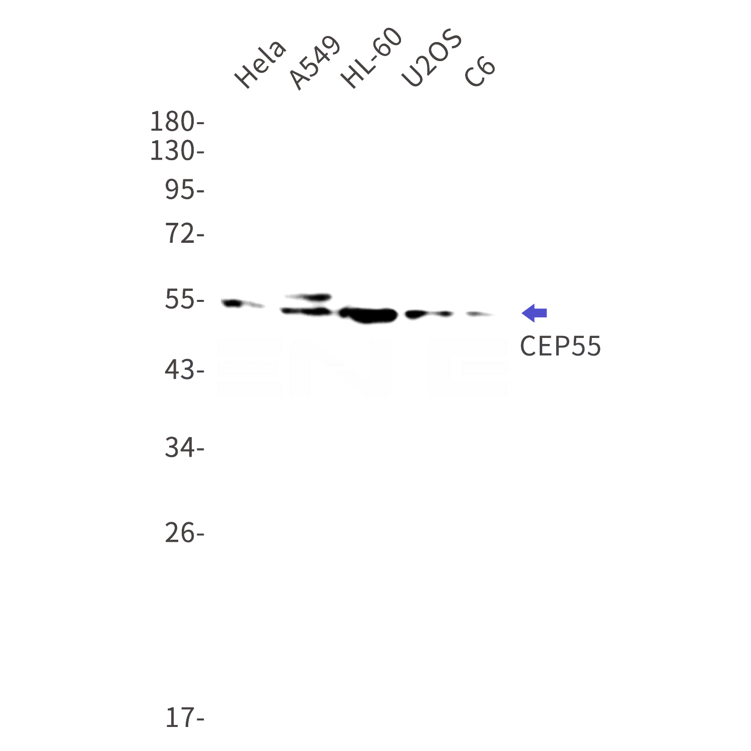 Western blot detection of CEP55 in Hela,A549,HL-60,U2OS,C6 cell lysates using CEP55 Rabbit mAb(1:1000 diluted).Predicted band size:54kDa.Observed band size:55kDa.