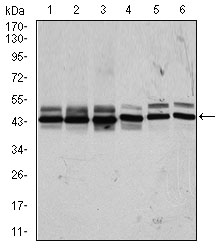 Western blot analysis using CSNK2A2 mouse mAb against HeLa (1), MCF-7 (2), HepG2 (3), Jurkat (4), NIH3T3 (5), and PC-12 (6) cell lysate.