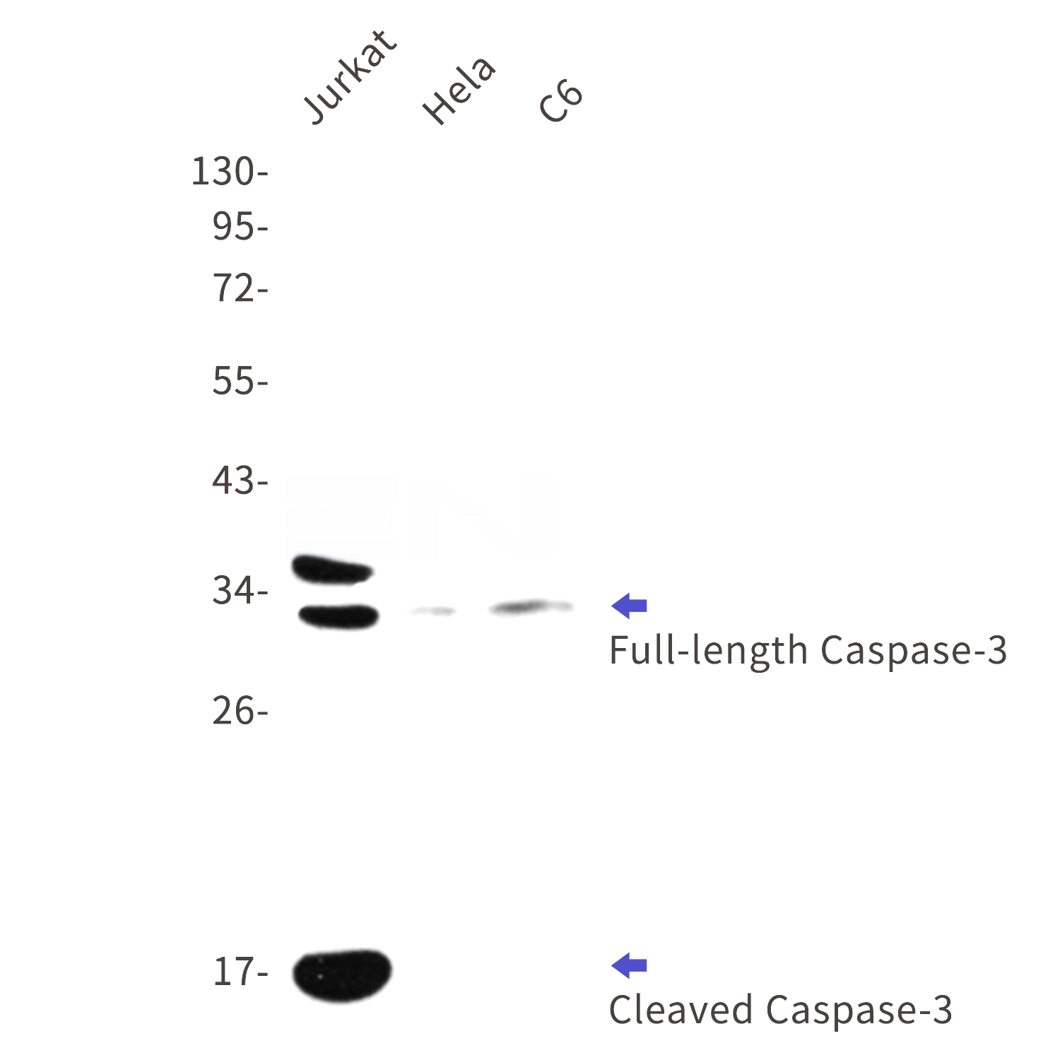 Western blot analysis of active Caspase-3 expression in Jurkat,C6 and Hela cell lysates using active Caspase-3 antibody at 1/1000 dilution.Predicted band size:17KDa.Observed band size:35,32,17KDa.