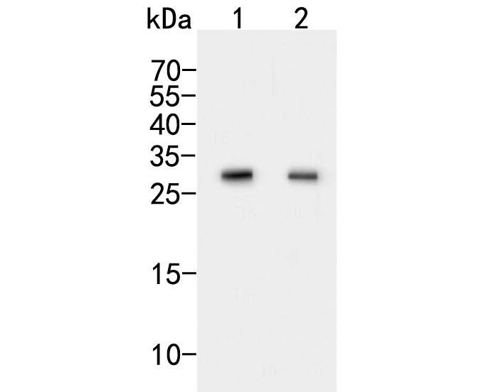 Fig1:; Western blot analysis of CLIC2 on different lysates. Proteins were transferred to a PVDF membrane and blocked with 5% BSA in PBS for 1 hour at room temperature. The primary antibody ( 1/500) was used in 5% BSA at room temperature for 2 hours. Goat Anti-Rabbit IgG - HRP Secondary Antibody (HA1001) at 1:5,000 dilution was used for 1 hour at room temperature.; Positive control:; Lane 1: K562 cell lysate; Lane 2: Mouse lung tissue lysate