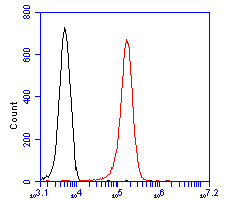 Fig2:; Flow cytometric analysis of CLIC2 was done on K562 cells. The cells were fixed, permeabilized and stained with the primary antibody ( 1/50) (red). After incubation of the primary antibody at room temperature for an hour, the cells were stained with a Alexa Fluor 488-conjugated Goat anti-Rabbit IgG Secondary antibody at 1/1000 dilution for 30 minutes.Unlabelled sample was used as a control (cells without incubation with primary antibody; black).
