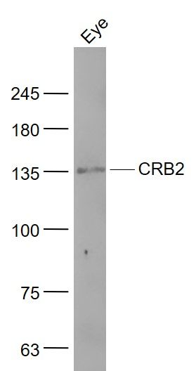 Fig5: Sample:; Eye(Rat) Lysate at 40 ug; Primary: Anti- CRB2 at 1/1000 dilution; Secondary: IRDye800CW Goat Anti-Rabbit IgG at 1/20000 dilution; Predicted band size: 100/123/131 kD; Observed band size: 135 kD