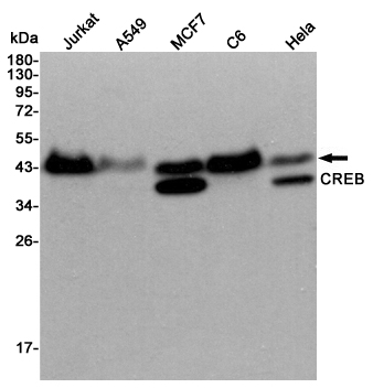 Western blot detection of CREB in Jurkat,A549,MCF7,C6 and Hela cell lysates using CREB mouse mAb (1:3000 diluted).Predicted band size:43KDa.Observed band size:43KDa.