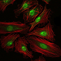 Immunofluorescence analysis of Hela cells using CREB1 mouse mAb (green). Red