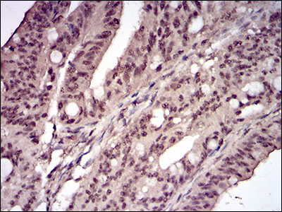 Immunohistochemical analysis of paraffin-embedded rectum cancer tissues using CCNE1 mouse mAb with DAB staining.