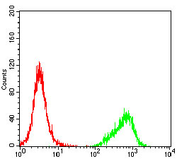 Flow cytometric analysis of K562 cells using CCNE1 mouse mAb (green) and negative control (red).