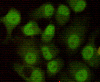 Immunocytochemistry stain of Hela using DNA-PKcs mouse mAb (1:200).