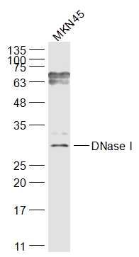 Fig2: Sample:; MKN45(Human) Cell Lysate at 30 ug; Primary: Anti-DNase I at 1/1000 dilution; Secondary: IRDye800CW Goat Anti-Rabbit IgG at 1/20000 dilution; Predicted band size: 29 kD; Observed band size: 29 kD
