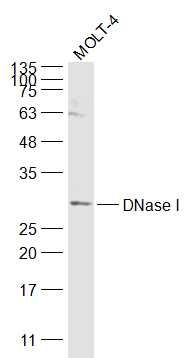 Fig1: Sample:; MOLT-4(Human) Cell Lysate at 30 ug; Primary: Anti-DNase I at 1/1000 dilution; Secondary: IRDye800CW Goat Anti-Rabbit IgG at 1/20000 dilution; Predicted band size: 29 kD; Observed band size: 29 kD